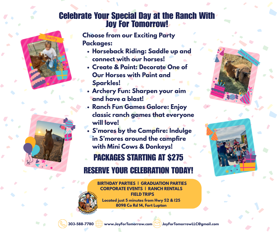 Make memories at Joy for Tomorrow Ranch with horseback riding, archery, ranch games, s’mores by the campfire, Nerf battles, and even a magical unicorn tea party. Just minutes from Hwy 52 & I-25 in Fort Lupton, we host birthdays, field trips, and group celebrations in a unique ranch setting.